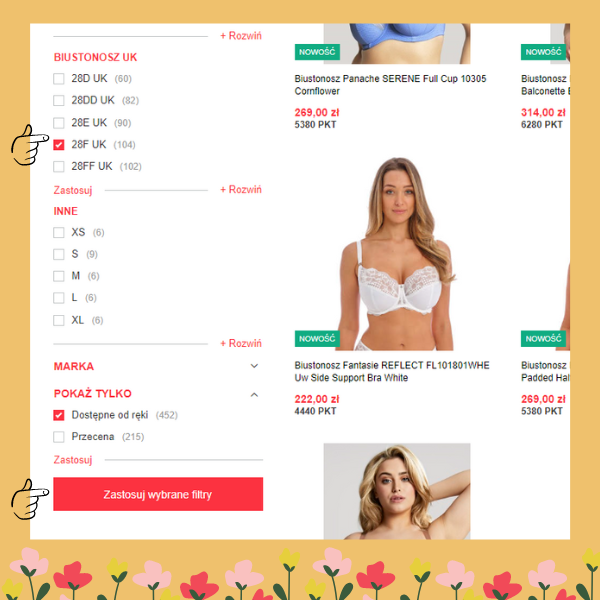 - Korzystając z poniższej podpowiedzi, zobaczysz wyłącznie biustonosze i majtki w Twoim rozmiarze.