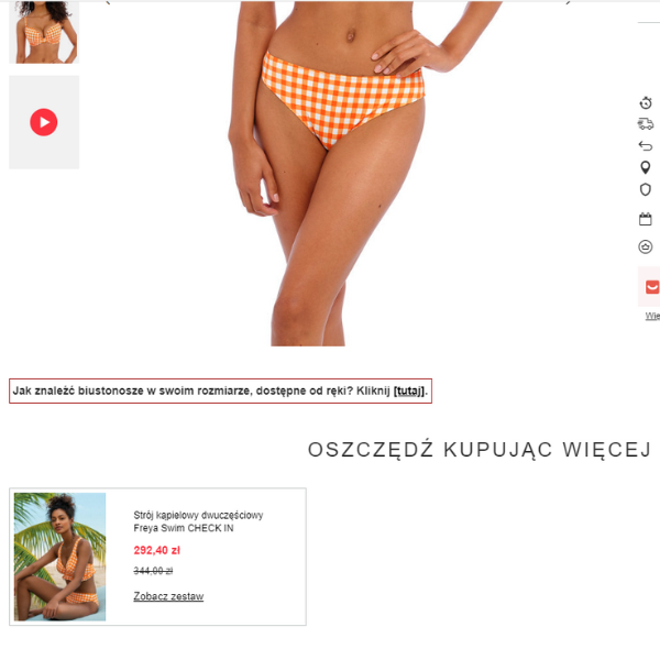 Zwróć uwagę na zestawy! Pozwalają na tańszy zakup stroju (lub bielizny, ale tę znajdziesz w innym miejscu). Nie wszystkie komplety dwuczęściowe pojawiają się podczas korzystania z wyszukiwarki, ale znajdziesz je w dziale PRZECENY lub zobaczysz propozycje w kartach niektórych produktów, np. jak na poniższym zdjęciu.