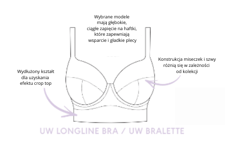 Na pierwszy rzut oka widzimy, czym różni się longline bra od innych fasonów. Niektórzy mówią o nim biustonosz przedłużany lub półgorset - jego cechą charakterystyczną jest przedłużony pas obwodu, kończący się wyraźnie niżej niż pod samym biustem. Za sprawą pięknej koronki zyskujemy modny efekt crop top.