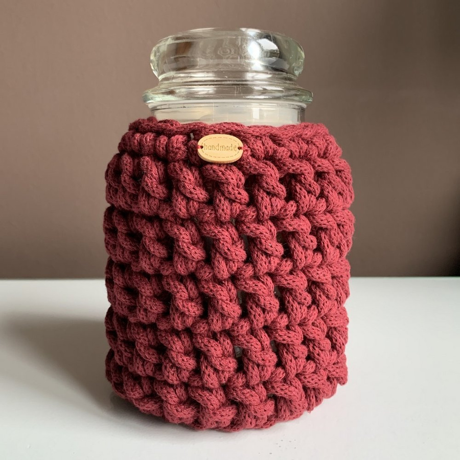 Osłonka na świecę zapachową ze sznurka bawełnianego wykonana na szydełku. Poza tym, że wygląda pięknie i stylowo, ułatwia rozgrzanie świecy do ścianek.