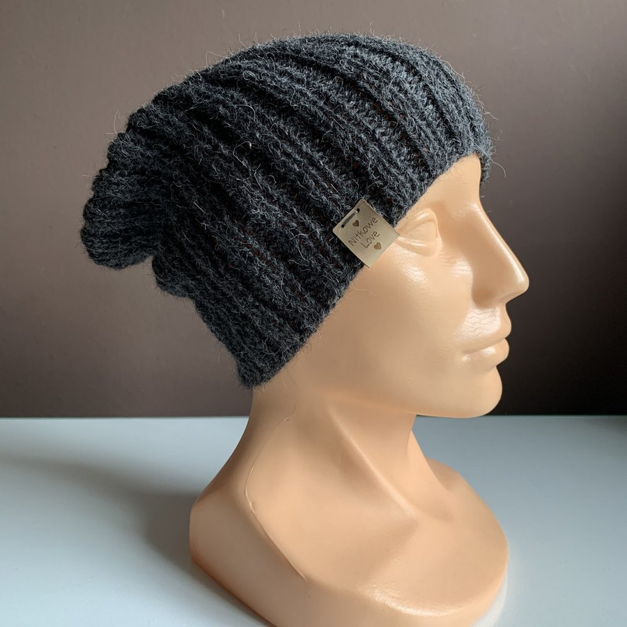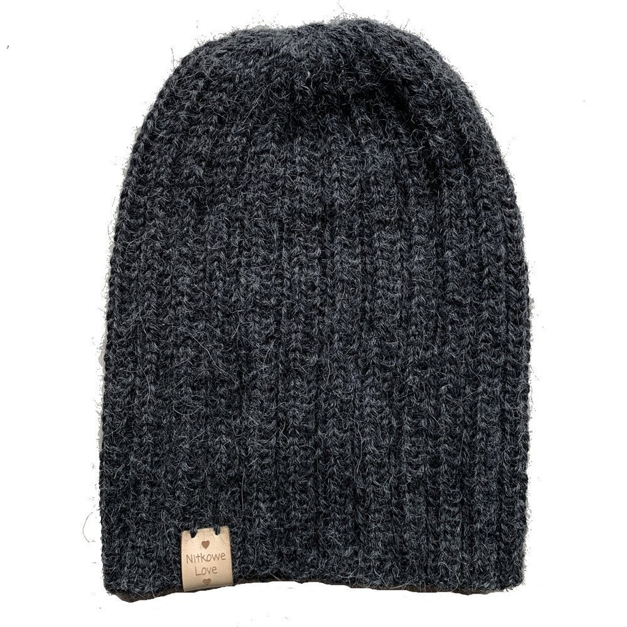 Czapka 100% alpaka jest ozdobiona metką Nitkowe Love ze skóry ekologicznej, którą można łatwo odpiąć do prania.