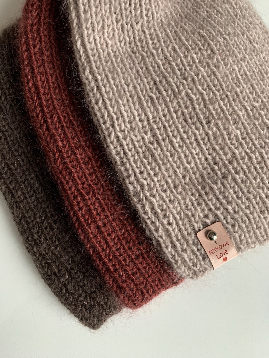 Czapka damska jest ozdobiona metką Nitkowe Love ze skóry ekologicznej, którą można łatwo odpiąć do prania.