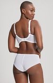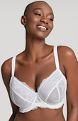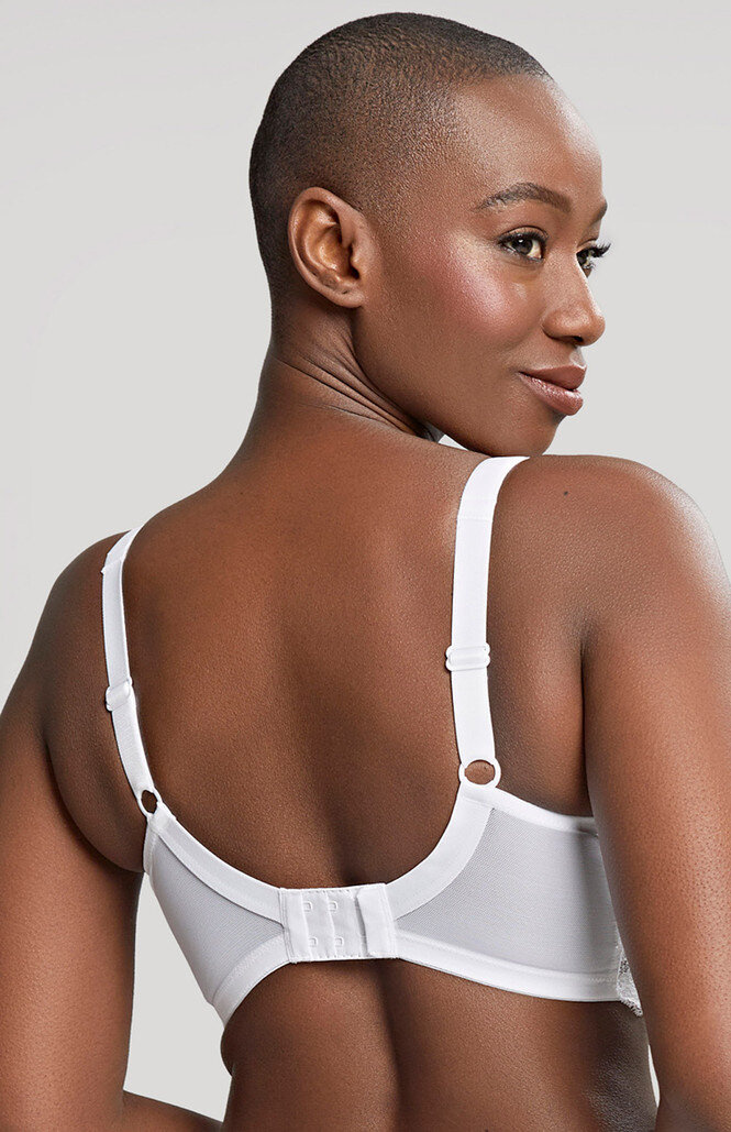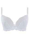 Biustonosz Panache Ana plunge wyposażono w stabilizujące dolne miseczki i elastyczną koronkę oraz wewnętrzny boczny panel, aby zapewnić wsparcie i unieść pełniejszy biust. Konstrukcja oparta na kołysce i zastosowanie tkaniny powermesh to gwarancje solidnego i wygodnego wsparcia aż do miseczki H. Niezwykły kobiecy akcent to satynowa kokardka z koralikami na mostku biustonosza.