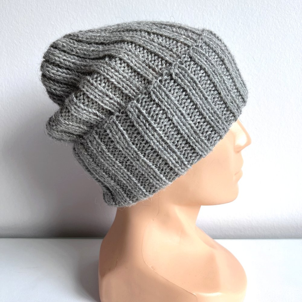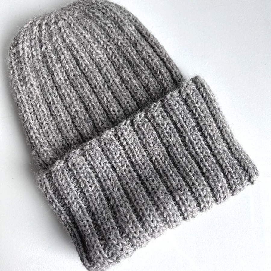 - Czapka wywijana zrobiona ręcznie na drutach Prążki 100% Alpaka 501 Jasny Szary