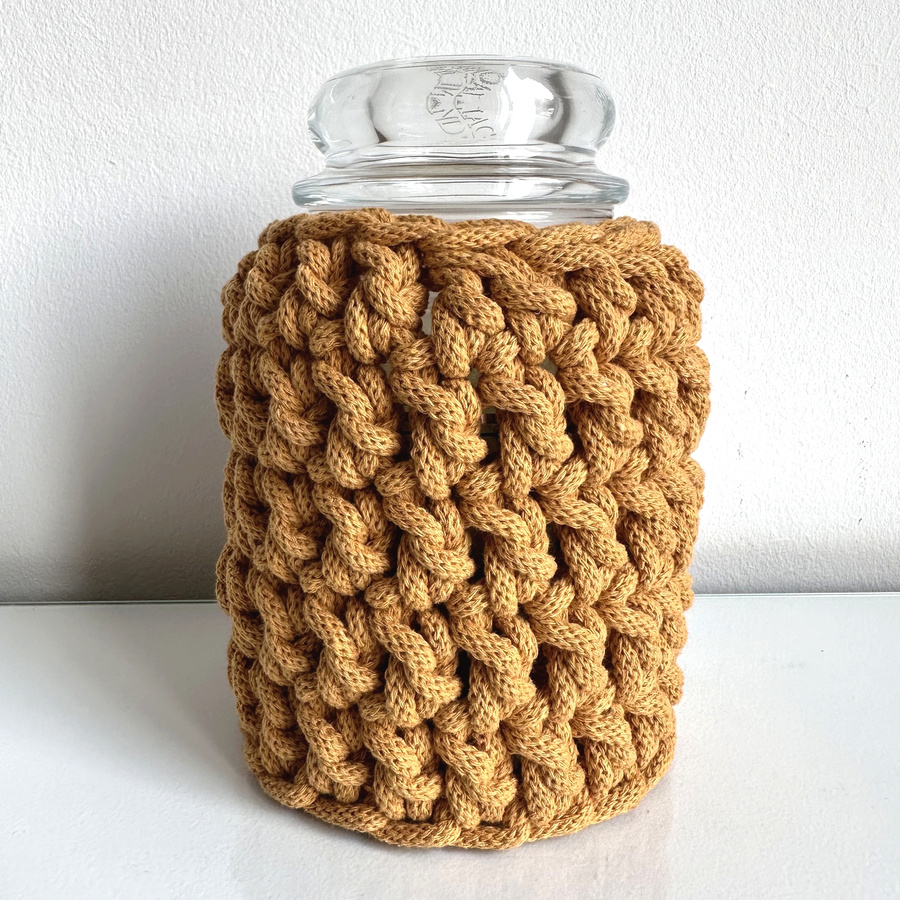 Osłonka na świecę zapachową ze sznurka bawełnianego wykonana na szydełku. Poza tym, że wygląda pięknie i stylowo, ułatwia rozgrzanie świecy do ścianek.