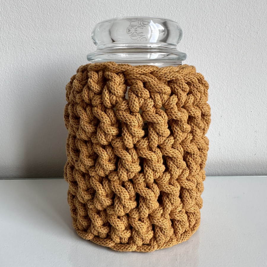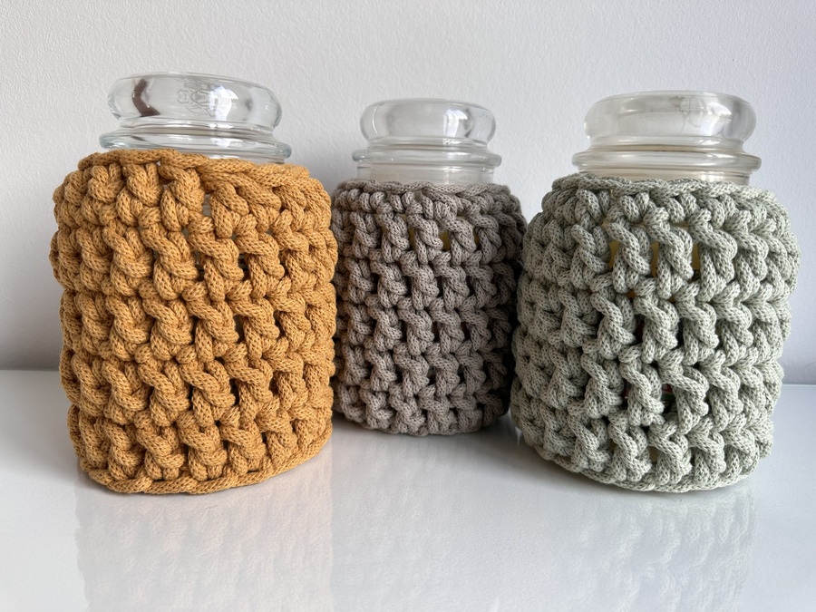 Ręcznie robiony Sweterek na świecę ze sznurka bawełnianego 665 oliwka
