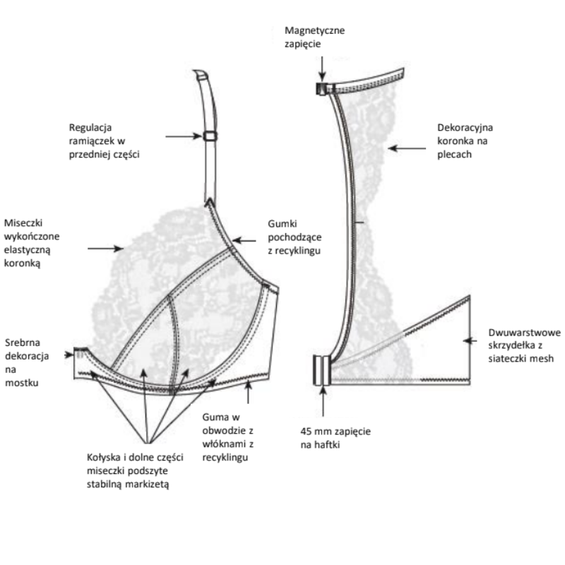 - 15mm gumki w obwodzie z materiałów z recyklingu to stabilność podtrzymania aż do miseczki J i dbałość o środowisko naturalne.