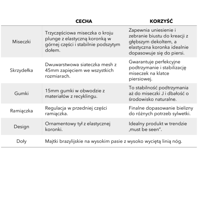 - Trzyczęściowa miseczka zapewnia uniesienie i zebranie biustu do kreacji z głębszym dekoltem, a elastyczna koronka idealnie dopasowuje się do piersi.