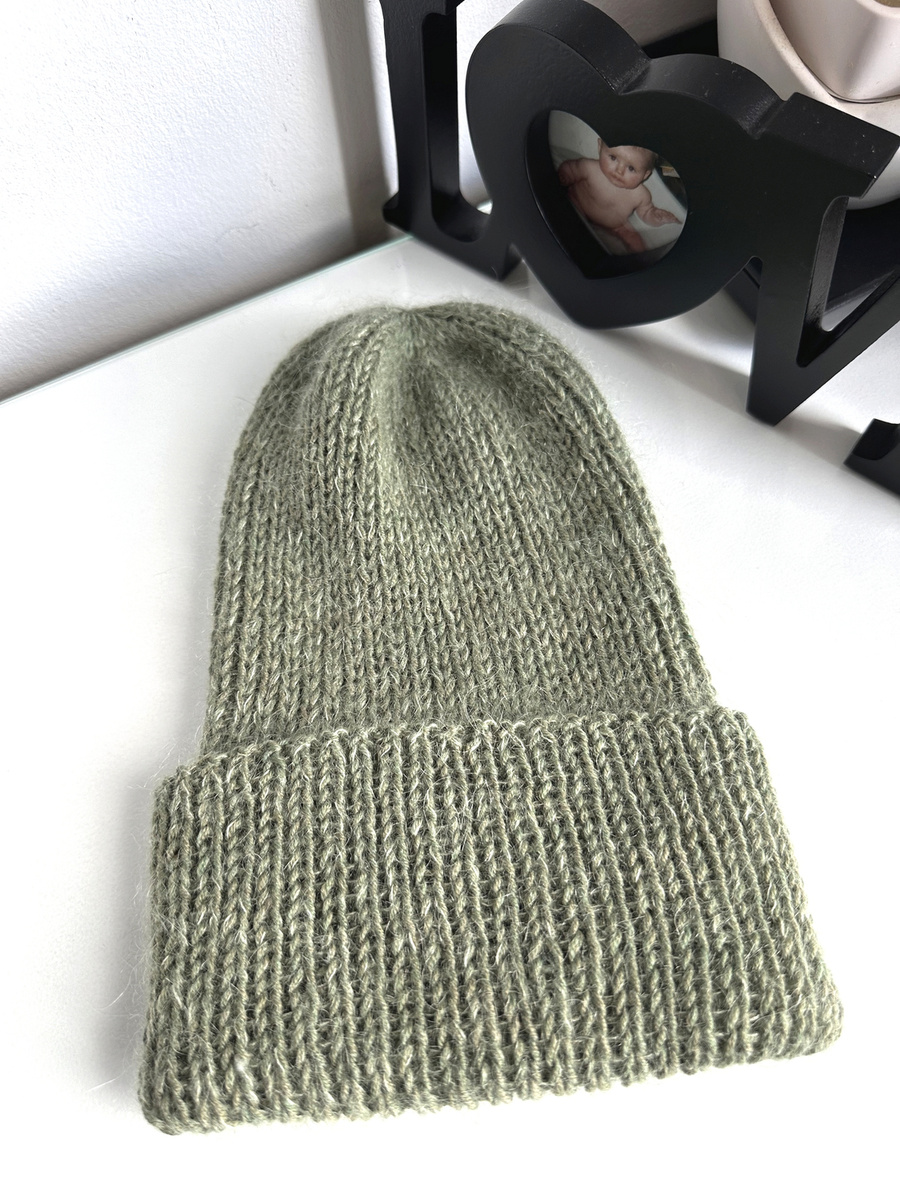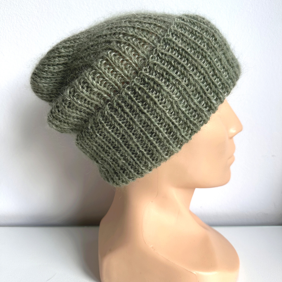 Ręcznie robiona czapka beanie AUREA 100% Baby Merino plus moher i jedwab 38/18 Oliwka