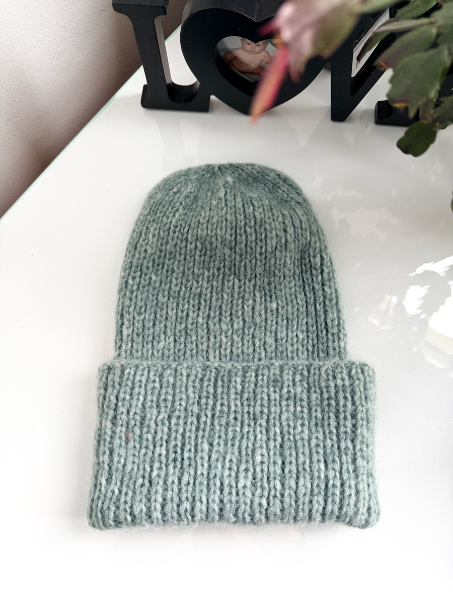 Ciepła czapka ręcznie robiona wywijana CHMURKA Alpaka 30 zielona szałwia