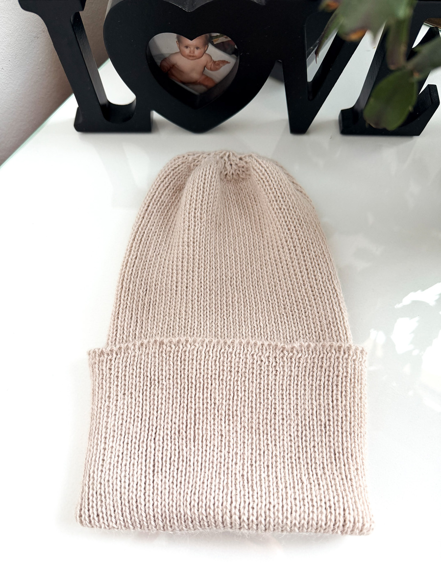 Czapka 100% alpaka jest ozdobiona metką Nitkowe Love ze skóry ekologicznej, którą można łatwo odpiąć do prania.