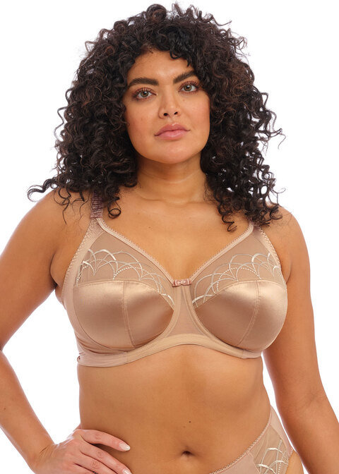 Call the shots with confidence in Cate. A real Elomi classic, this collection in a Hazel colourway offers incomparable comfort and support all day long. Featuring a semi-sheer embroidered top cup with a chic intersecting arc design. Grosgrain textured straps and a looped neck edge trim completes the look.