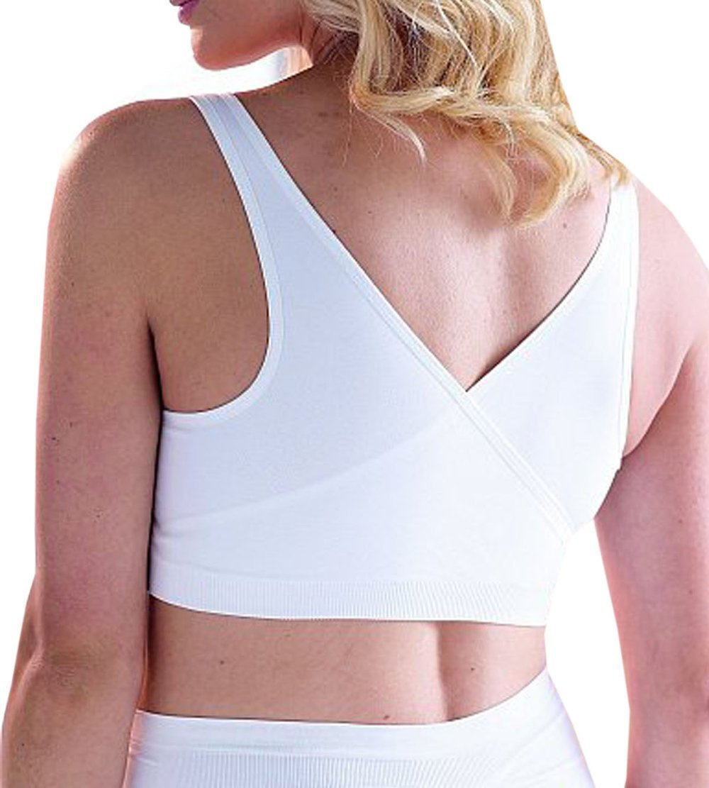 Biustonosz ciążowy z bezszwowo uformowanych miseczek z oddychającej mikrofazy. Podpory biustu wszyte aż do ramiączek, mają szczególnie dobre podtrzymanie. Szerokie i miękko wyścielone ramiączka 3-częściowa, wzmocniona tylna część.