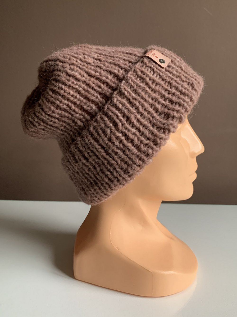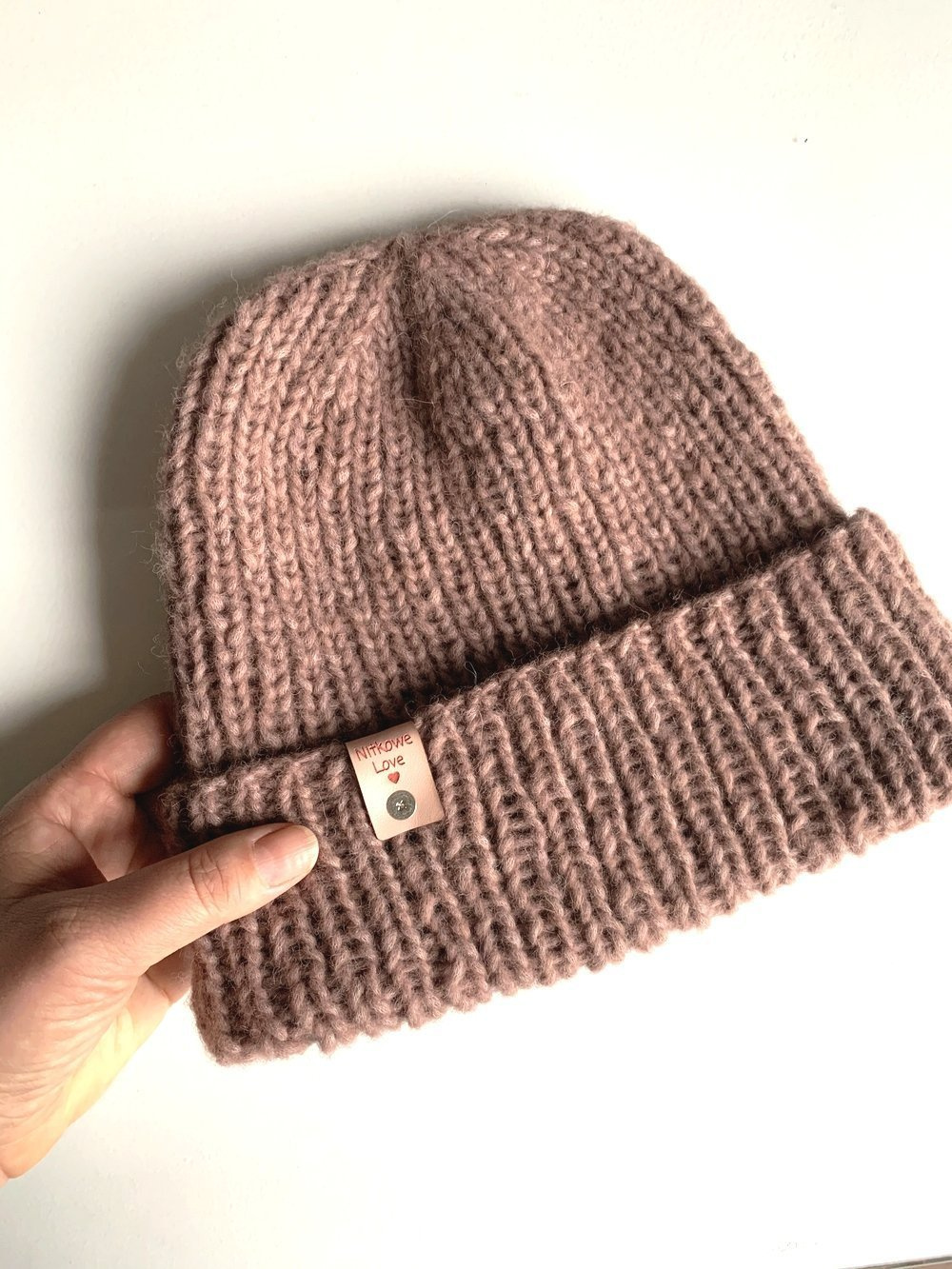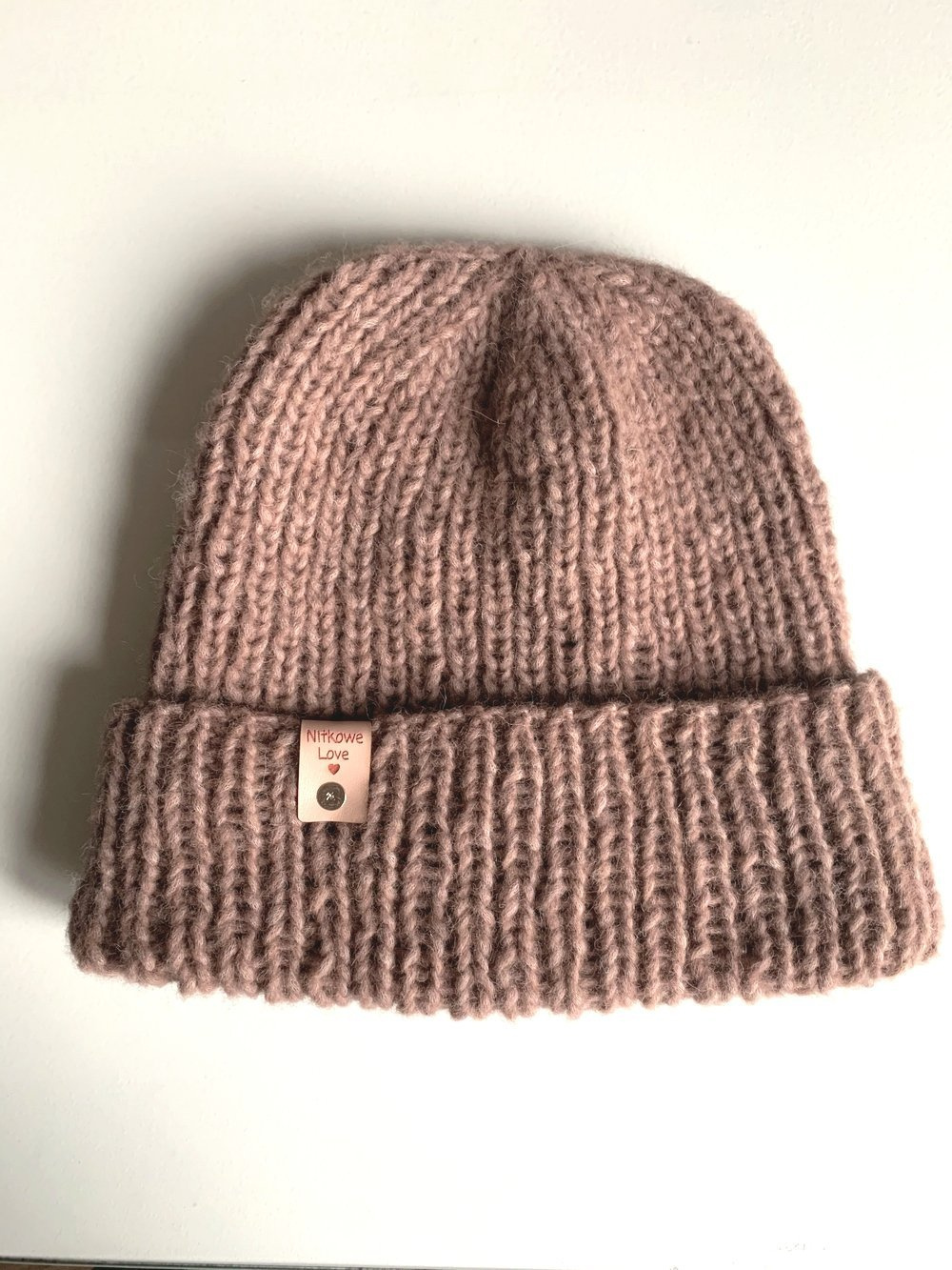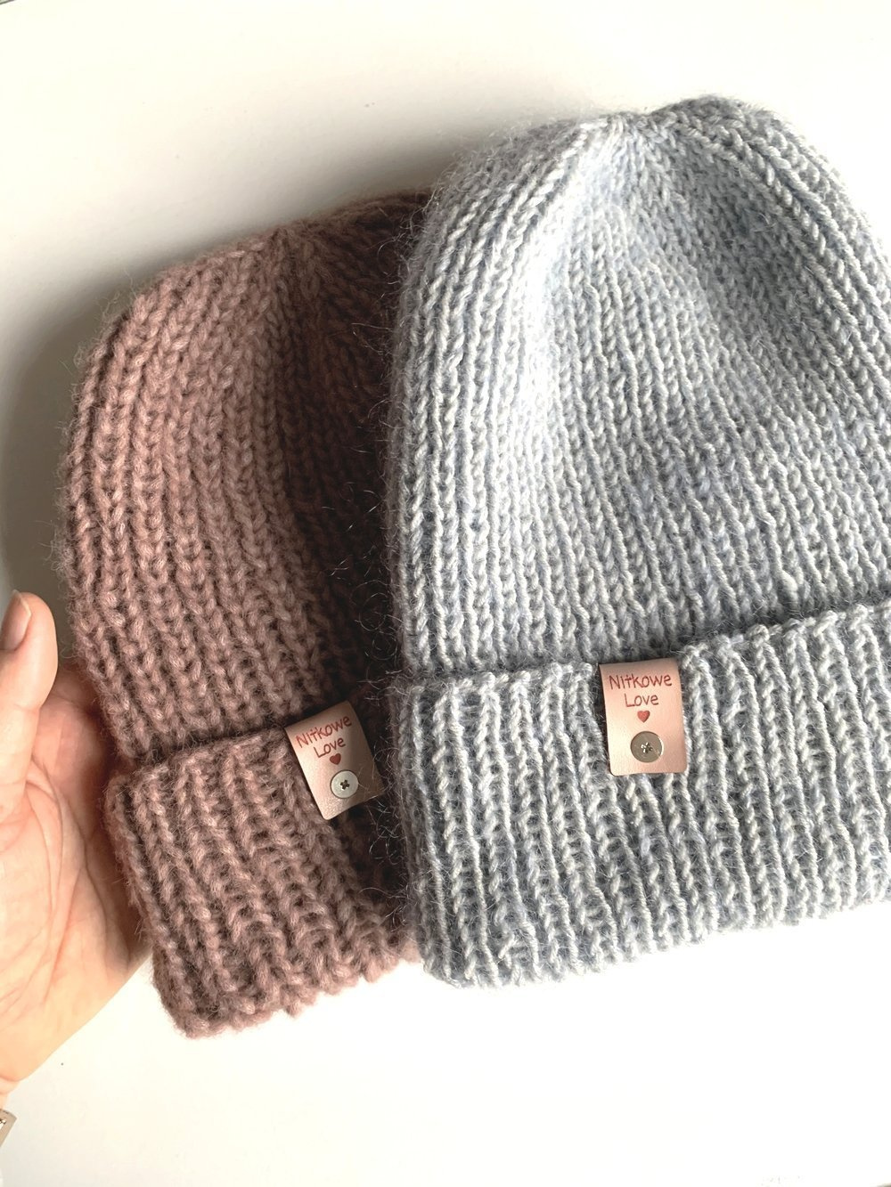 Czapka handmade jest ozdobiona metką Nitkowe Love ze skóry ekologicznej, którą można łatwo odpiąć do prania.