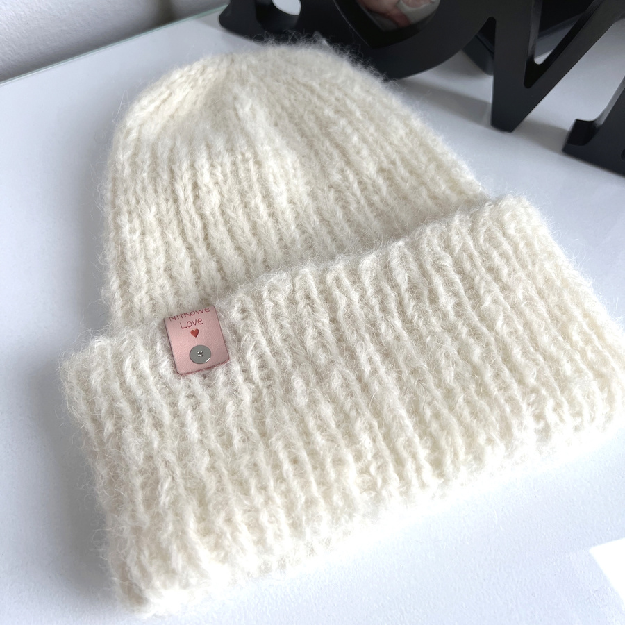 Czapka handmade jest ozdobiona metką Nitkowe Love ze skóry ekologicznej, którą można łatwo odpiąć do prania.