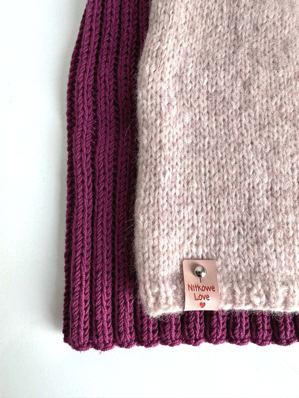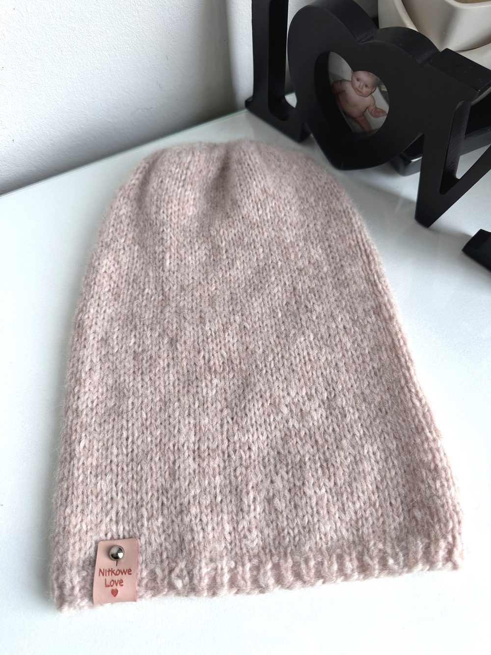 Czapka handmade jest ozdobiona metką Nitkowe Love ze skóry ekologicznej, którą można łatwo odpiąć do prania.