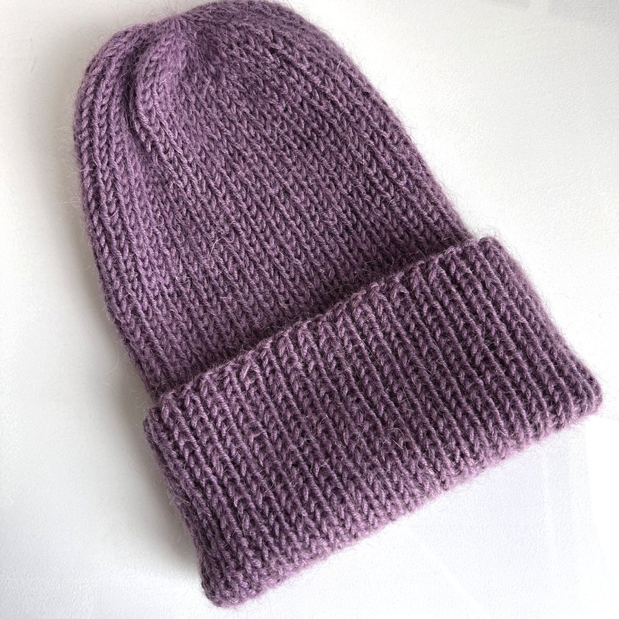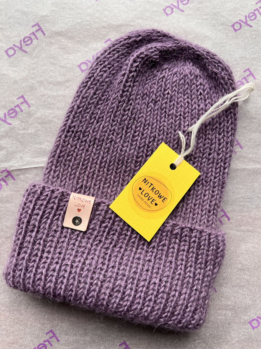 • Czapka robiona ręcznie hand made Wywijana Ściągacz 100% Baby Merino plus moher i jedwab 40 Ametyst