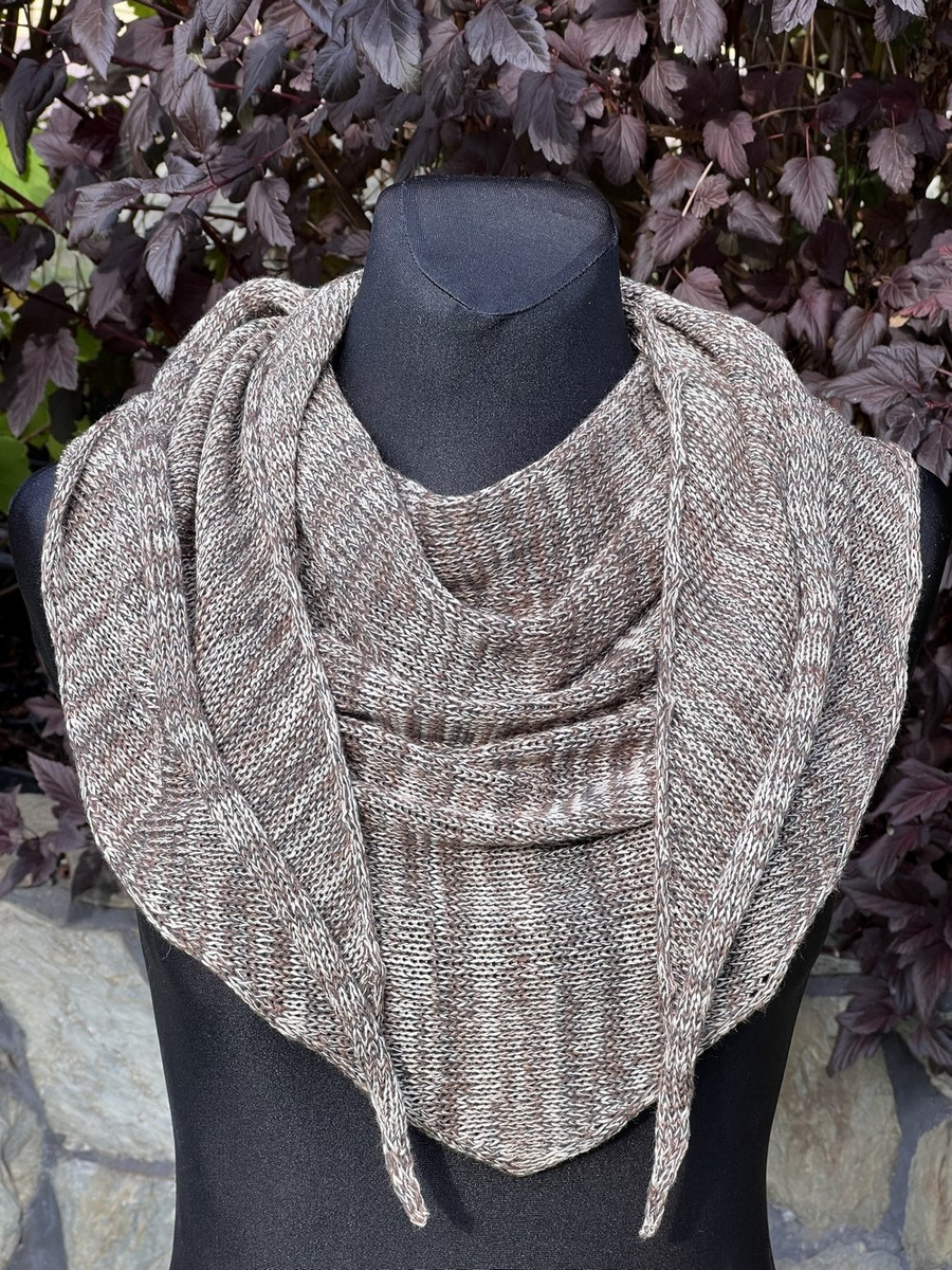 Elegancka chusta z wysokiej jakości mieszanki bawełny i akrylu wykonana przeze mnie na maszynie dziewiarskiej z troską i dbałością o każdy szczegół. Wykończona ręcznie.