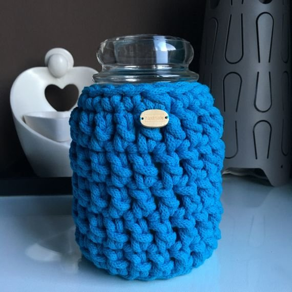 Ręcznie robiony Sweterek na świecę ze sznurka bawełnianego 430 turkus