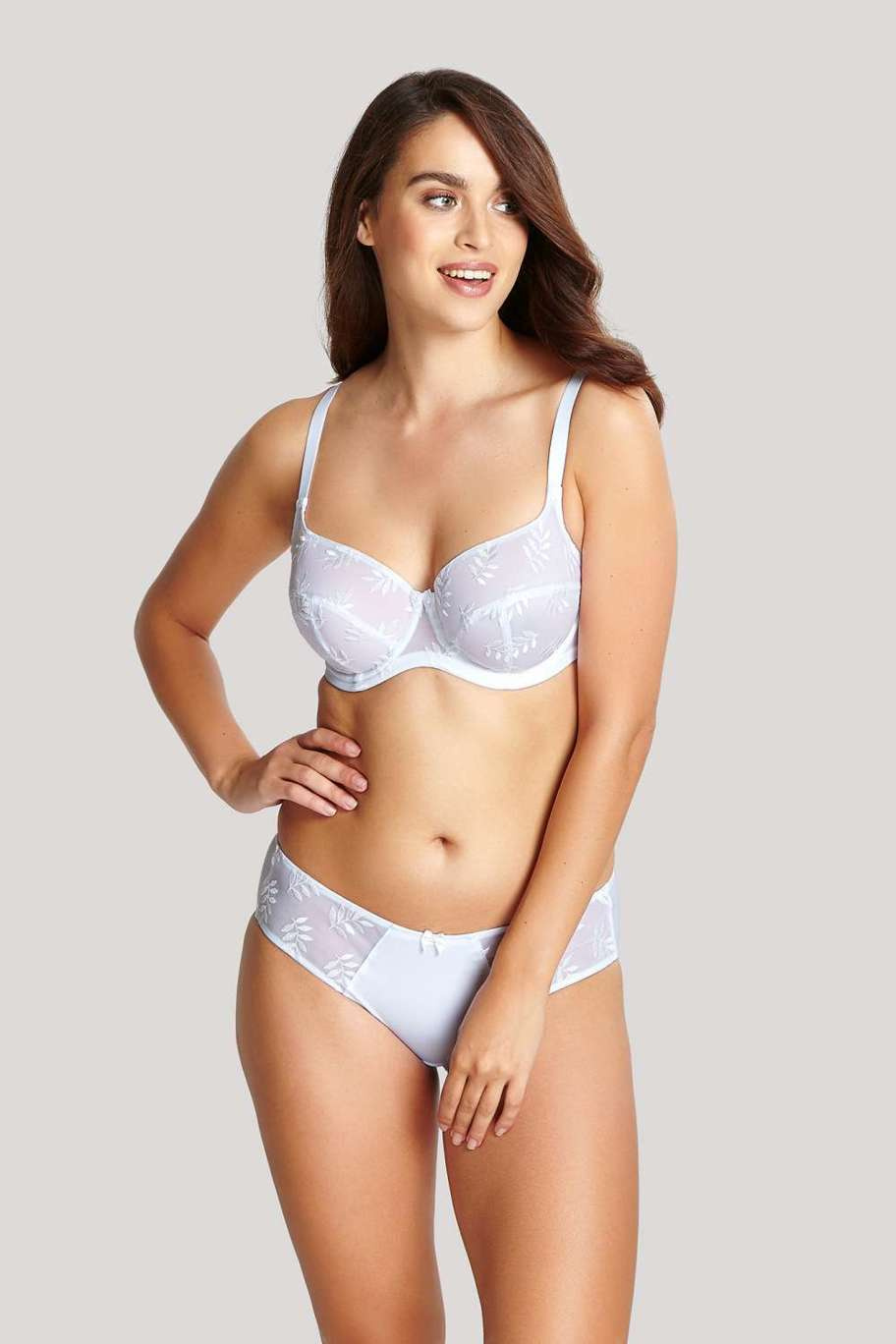 Biustonosz Panache Superbra TANGO 3251 Balconnet White. Bestseller w kolekcji Superbra by Panache. Znakomita sztywna siateczka z austriackim haftem - delikatny motyw listków. Miska dzielona na trzy części z pełną kołyską oferuje doskonałe podtrzymanie w kroju balkonowym, podszycie w dolnej części miski zapewnia uniesiony kształt. Ramiączka podszyte miękkim pluszem. Wzmocniony pas obwodu w rozmiarach powyżej GG dla dodatkowego komfortu. Regulowane na całej długości ramiączka dla idealnego dopasowania. Tango w całości został wykonany z laminowanego materiału, by zapewnić maksimum podtrzymania.