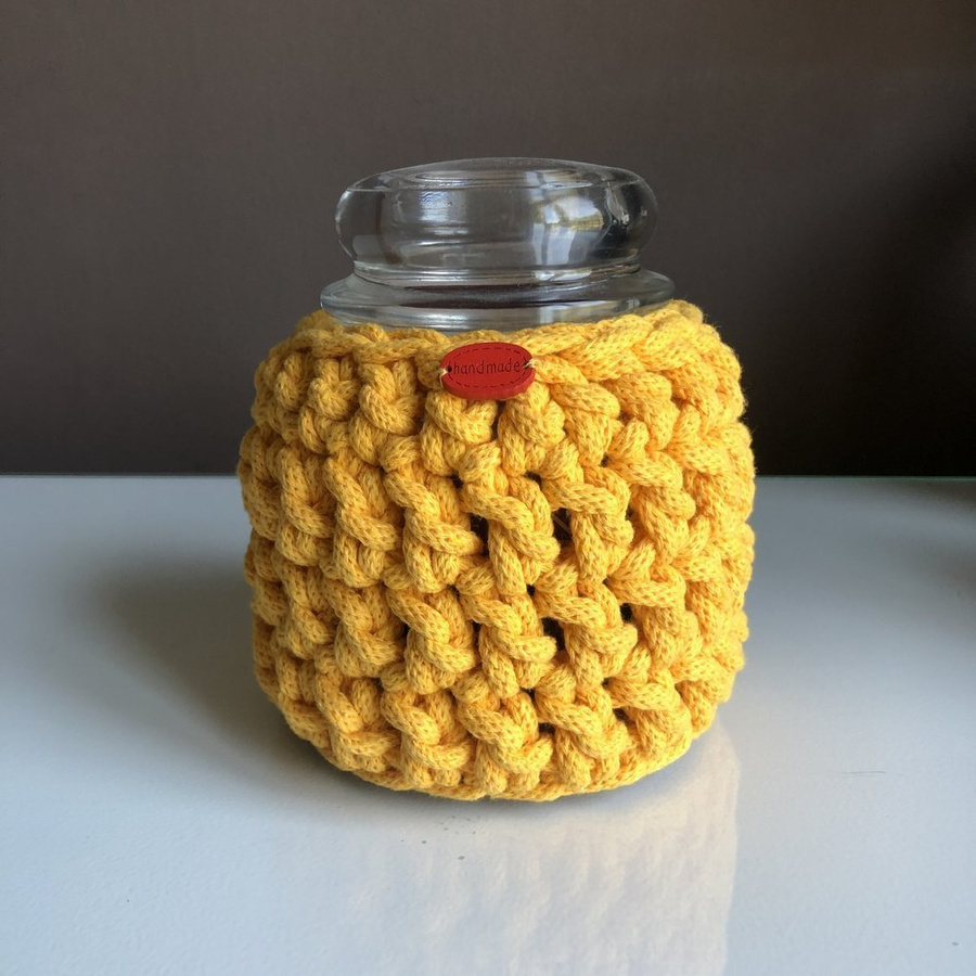 - Ręcznie robiony Sweterek na świecę średnią ze sznurka bawełnianego żółty