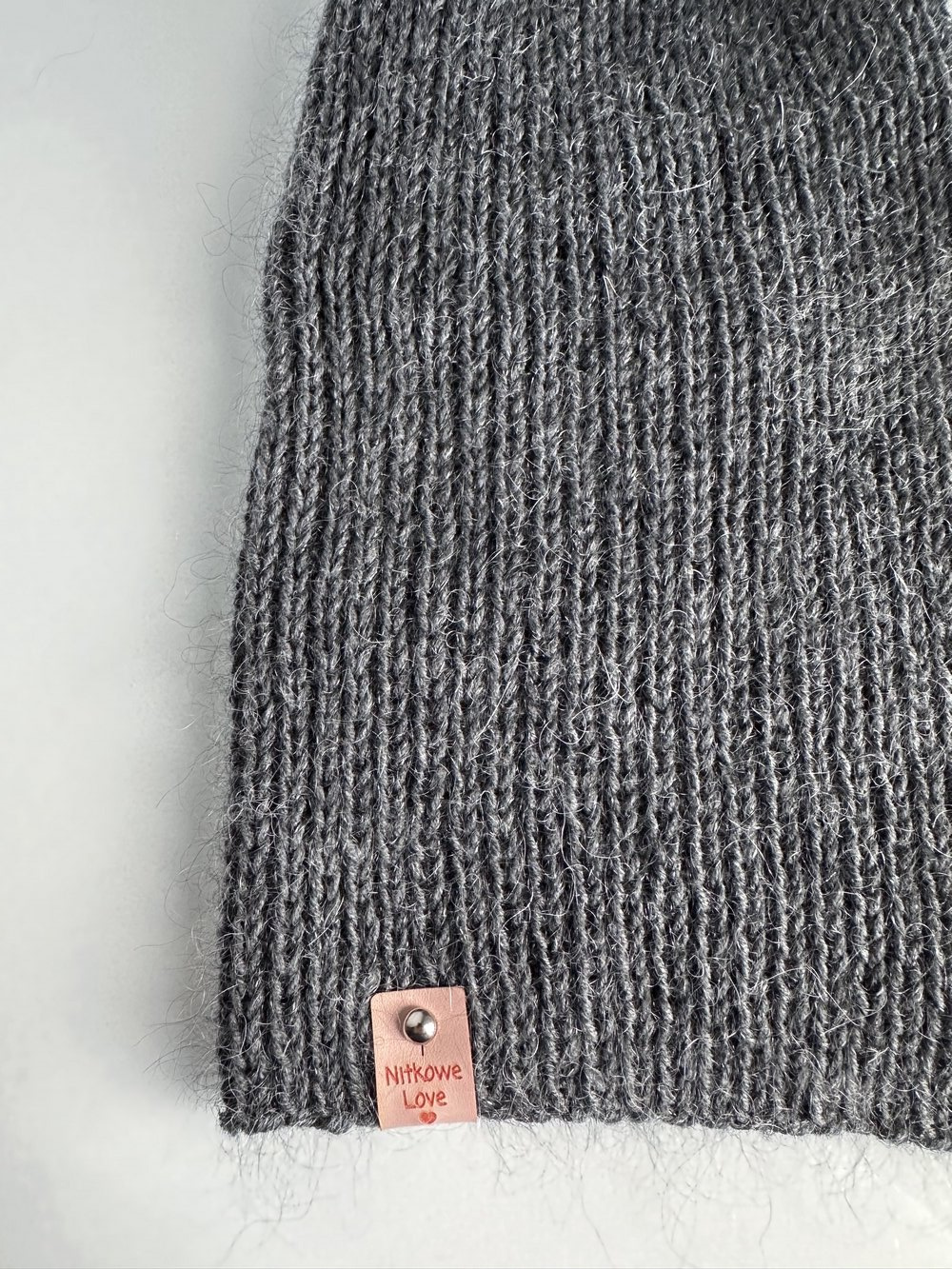 Czapka damska jest ozdobiona metką Nitkowe Love ze skóry ekologicznej, którą można łatwo odpiąć do prania.