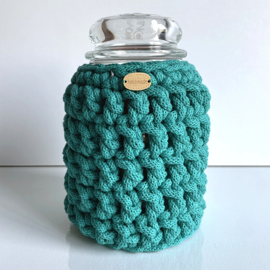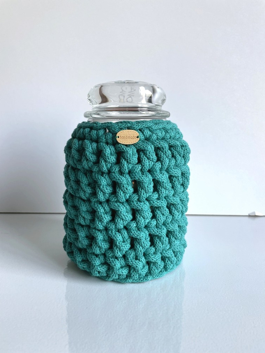 Ręcznie robiony Sweterek na świecę ze sznurka bawełnianego 630 Morski