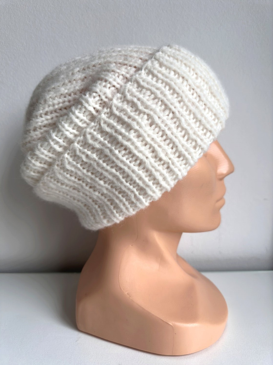 Ciepła czapka ręcznie robiona wywijana CHMURKA Alpaka 01 Ecru