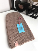 Do czapki przymocowana jest metka Nitkowe Love ze skóry ekologicznej, którą można łatwo odpiąć.