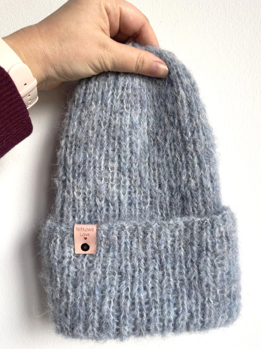 Czapka handmade jest ozdobiona metką Nitkowe Love ze skóry ekologicznej, którą można łatwo odpiąć do prania.