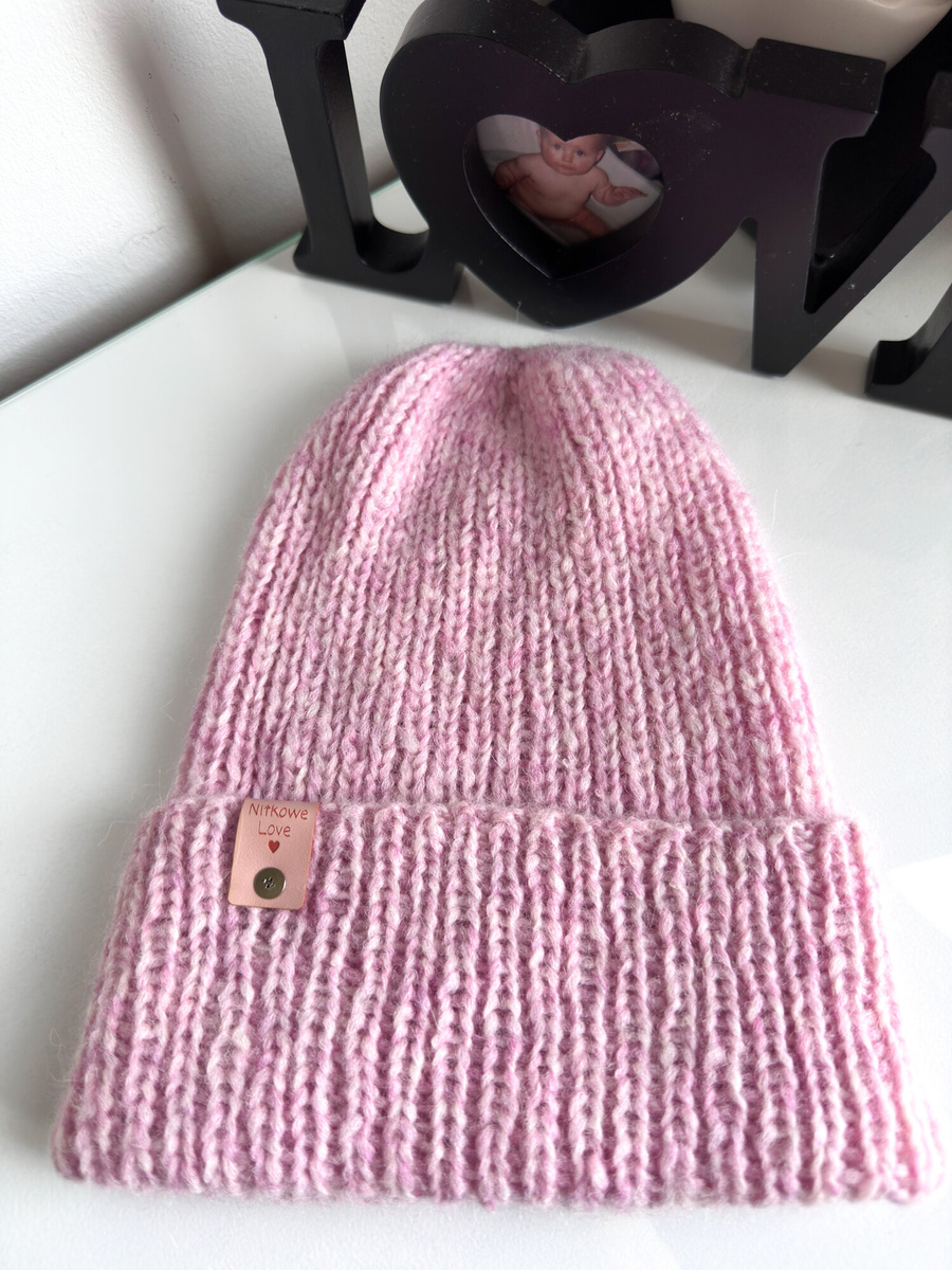 Ciepła czapka ręcznie robiona wywijana CHMURKA Alpaka 08 Jasny Róż