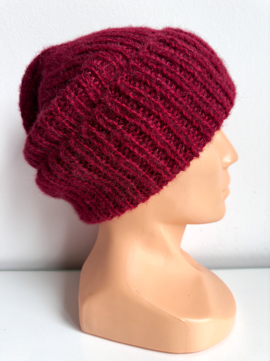 Ten model to klasyczna czapka beanie z wywinięciem w głębokim, bordowym odcieniu – praktyczna jako ciepła czapka damska na co dzień, ale też wystarczająco stonowana, by pasować do eleganckiego płaszcza. Dwie nitki przędzy (alpaka solo oraz mieszanka alpaki z jedwabiem) tworzą średniej grubości dzianinę z wyraźnym, miękkim włosem, która dobrze trzyma ciepło w typowych zimowych warunkach, a jednocześnie nie jest ciężka.