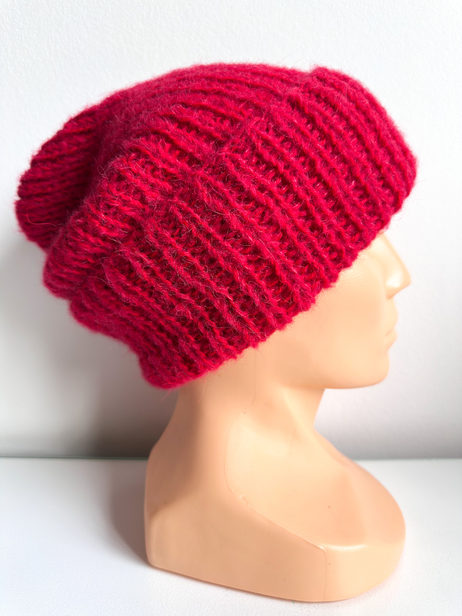 Ta czapka handmade powstaje z dwóch nitek – sprężystej przędzy 100% baby merino oraz mieszanki 77% alpaki i 23% jedwabiu. W praktyce daje to ciepłą czapkę zimową o średniej grubości: dobrze grzeje w chłodniejsze dni jesieni i zimy, a przy tym nie jest ciężka ani sztywna. Wywinięcie wzmacnia okolice uszu, a lekko oversize’owa forma sprawia, że czapka układa się miękko i nie opina głowy zbyt mocno.