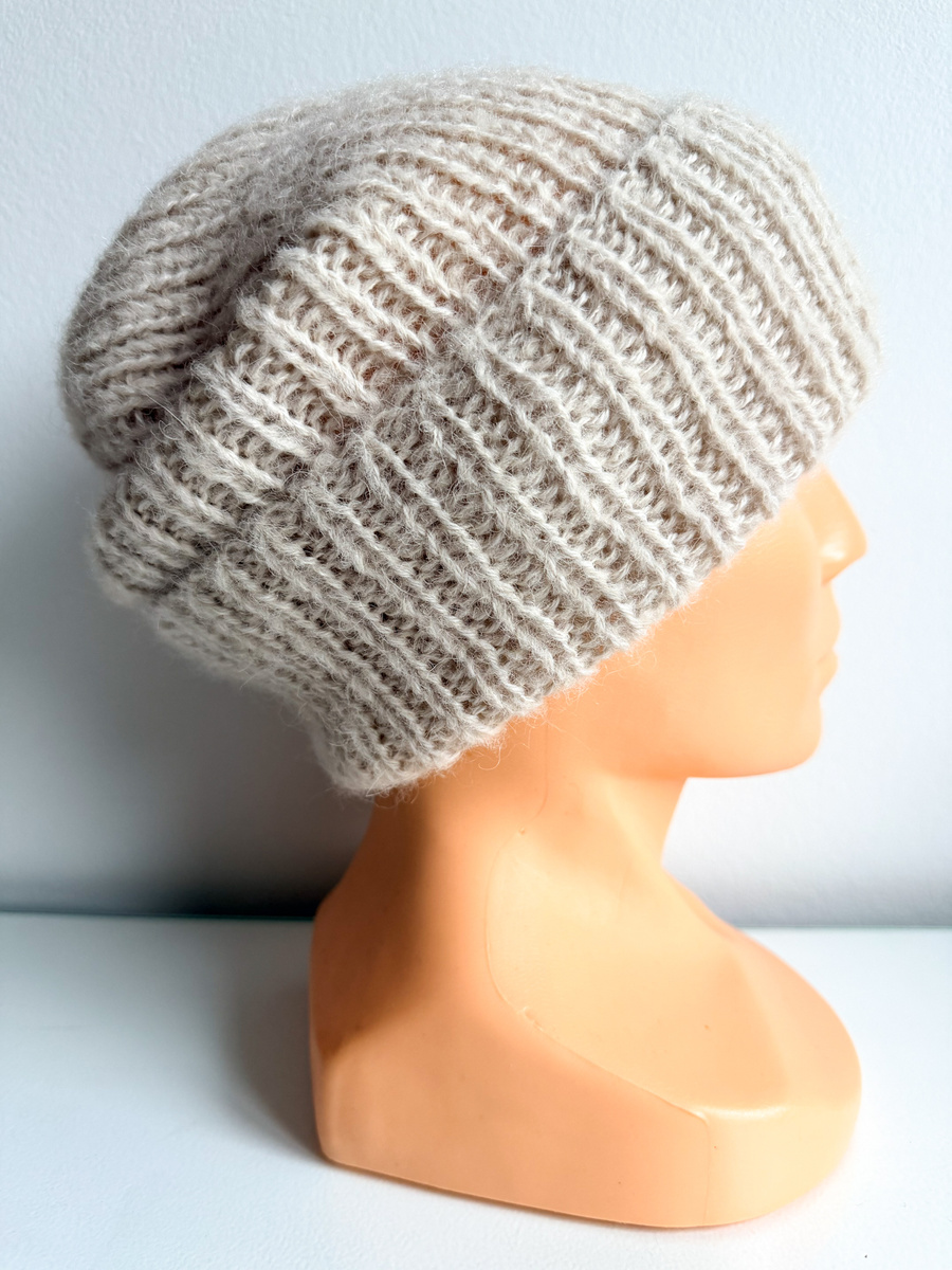 Ten model łączy funkcjonalność czapki z wywinięciem z miękką, puszystą dzianiną o wyraźnym włosku. Dwie nitki przędzy (jedna 100% alpaka, druga 77% alpaka, 23% jedwab) dają efekt lekkiej, ale dobrze grzejącej czapki, która sprawdzi się w codziennym noszeniu w mieście i na spacerach. Konstrukcja oversize z pojedynczym ściągaczem pozwala na swobodne ułożenie na głowie, bez mocnego ucisku.